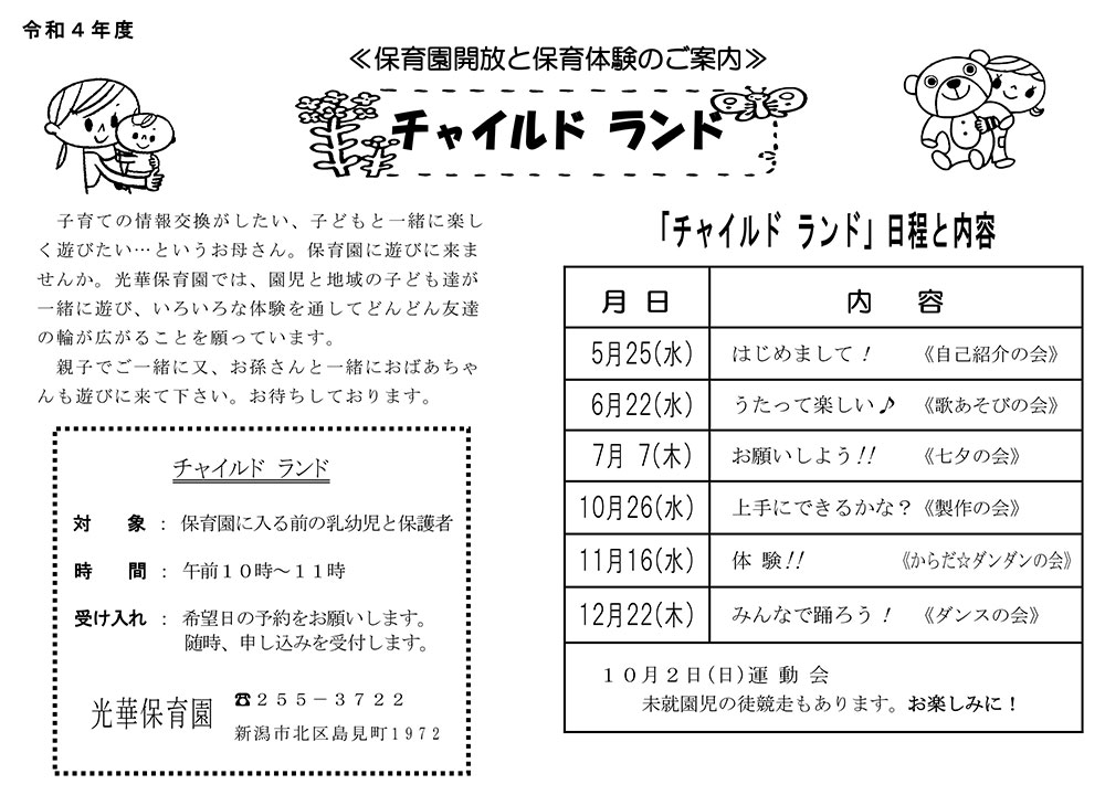 光華こども園では、こども園に入る前の乳幼児とその保護者様を対象に、未就園児教室「チャイルドランド」を開催しています。
