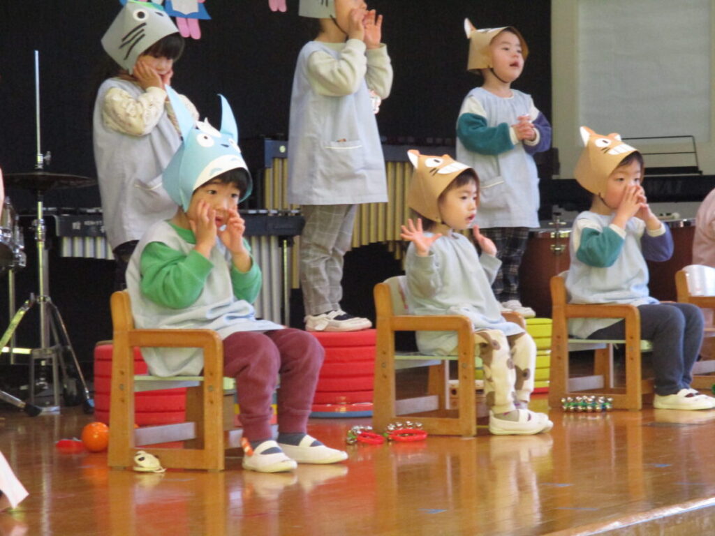 1歳児はトマトちゃん、2歳児はトトロになって可愛らしく手遊び歌や打楽器を使って歌いました。